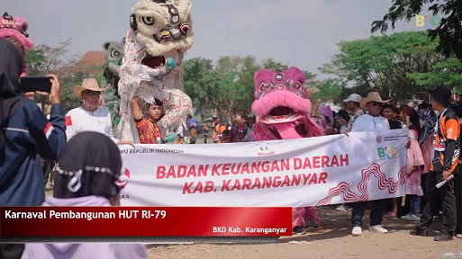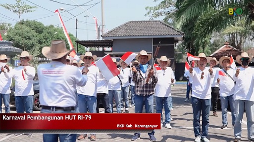 Tampak Badan Keuangan Daerah Kabupaten Karanganyar dengan nomor urut 6 VIP ikut berpartisipasi dalam karnaval pembangunan tersebut. Untuk tahun ini BKD Kabupaten Karanganyar mengusung tema “Unggul dalam Pengelolaan Keuangan, Profesional pada Pendapatan Daerah dan Aset Daerah ”. Terlihat karyawan-karyawati BKD Kabupaten Karanganyar memakai kostum Putih bertuliskan Logo HUT RI Ke-79 dan dibelakang tertulis dengan jelas tema dan Motto BKD Kabupaten Karanganyar serta dilengkapi dengan Topi koboy yang menambah gagah dan luwes penampilannya.
