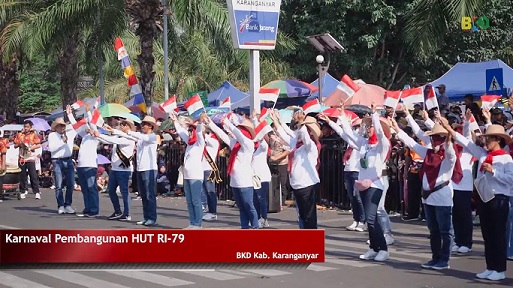 BKD KAB. KARANGANYAR---Karnaval Pembangunan digelar Pemerintah Kabupaten Karanganyar dalam rangka memperingati HUT Kemerdekaan RI ke-79. Terlihat ribuan masyarakat Kabupaten Karanganyar berbondong-bondong melihat aksi para peserta karnaval pembangunan yang mengambil rute mulai dari Alun-alun Karanganyar dan finish di panggung kehormatan di Depan Rumah Dinas Bupati Karanganyar.